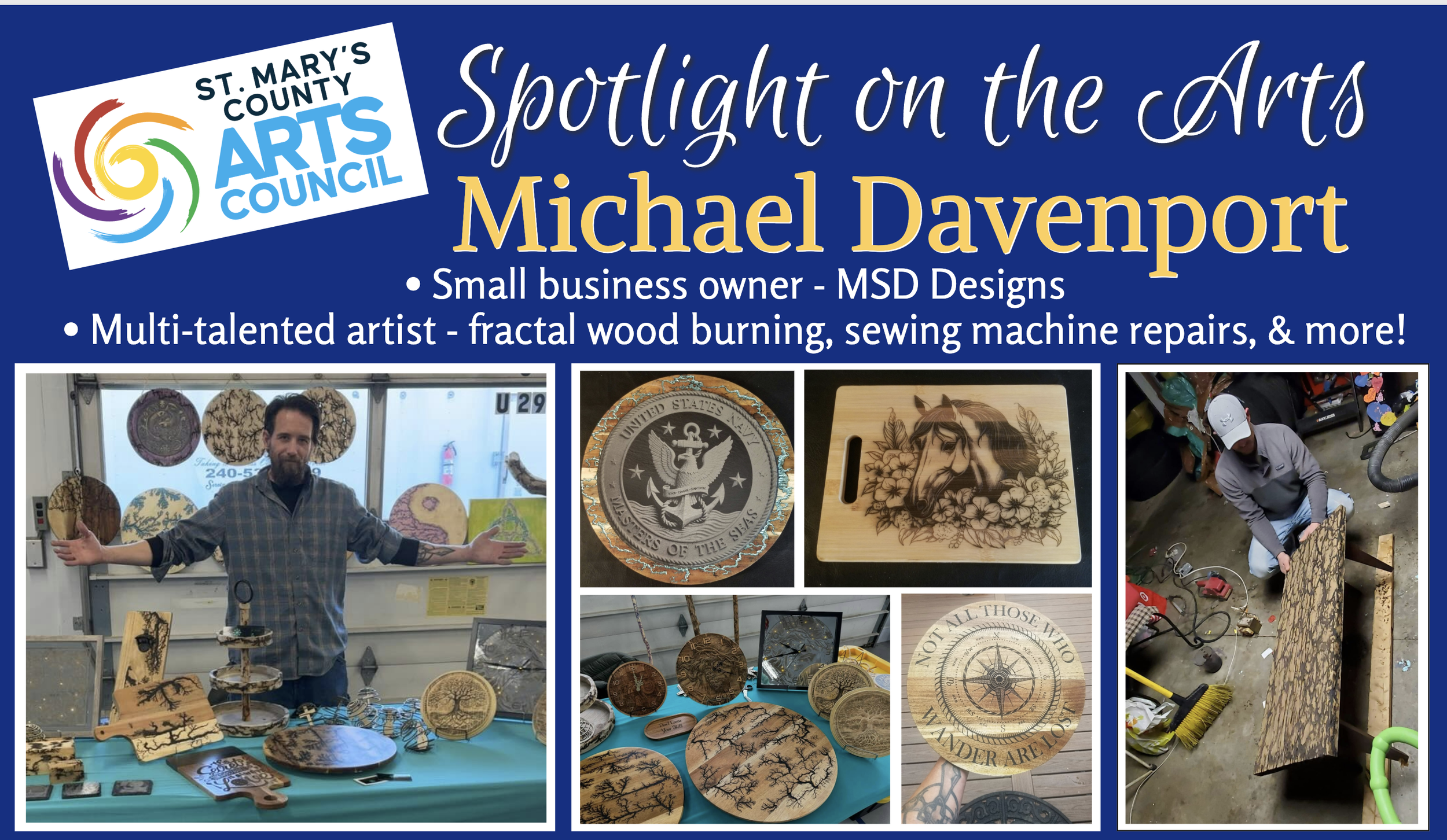Our Spotlight on the Arts shines brightly on Michael Davenport of MSD Designs! Michael creates unique art pieces through fractal art wood burning. He also performs sewing machine repairs and much more! Read more at the link below.